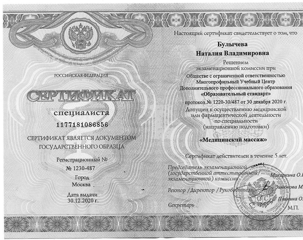 Сертификат специалиста, Москва, 2020. Выдан по итогам экзаменационной комиссии в учебном центре «Образовательный стандарт». Подтверждает право на профессиональную деятельность по специальности «медицинский массаж»