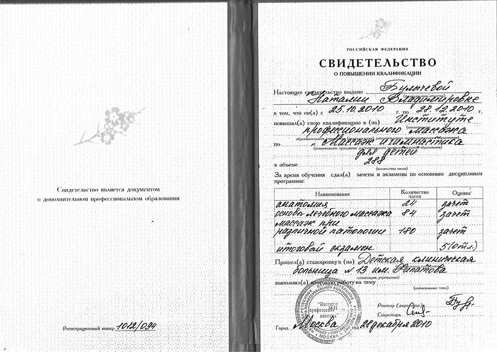 Свидетельство о повышении квалификации, Москва, 2010. Программа «Лечебная гимнастика для детей» в объёме 288 часов. Включает анатомию, основы лечебного массажа, педиатрическую патологию и методику гимнастики. Проходила стажировку в детской клинической больнице.