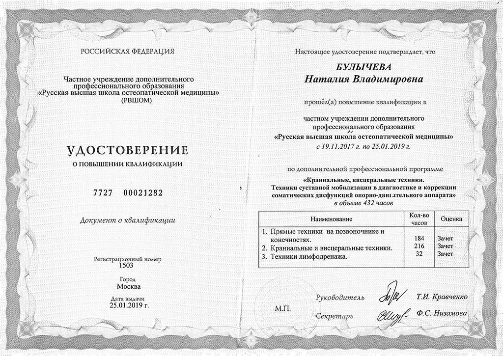 Удостоверение о повышении квалификации, Москва, 2019. Пройден курс в Русской высшей школе остеопатической медицины по программе «Краниальные и висцеральные техники, техники суставной мобилизации» в объёме 432 часа. Освоены методы работы с позвоночником, конечностями, лимфодренаж и висцеральные подходы.