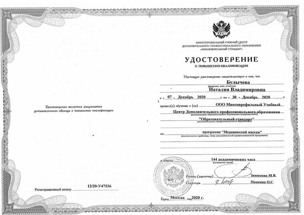 Удостоверение о повышении квалификации, Москва, 2020. Программа «Медицинский массаж» в объёме 144 академических часа. Обучение пройдено в многопрофильном учебном центре «Образовательный стандарт».