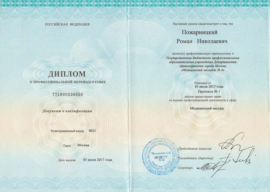 Диплом о профессиональной переподготовке, Москва, 2017. Выдан Медицинским колледжем №6 Департамента здравоохранения города Москвы. Подтверждает право на ведение профессиональной деятельности в сфере «медицинский массаж».
