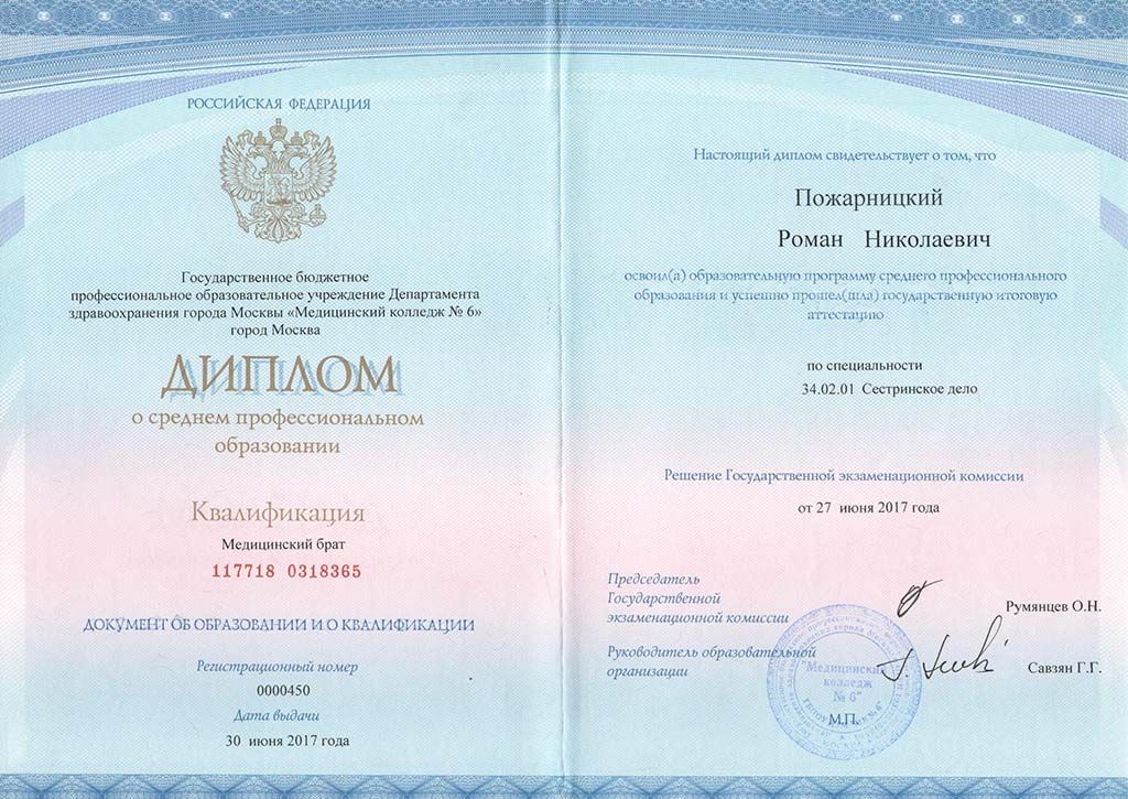 Диплом о среднем профессиональном образовании, Москва, 2017. Выдан Медицинским колледжем №6 Департамента здравоохранения города Москвы. Подтверждает получение квалификации «медицинский брат» по специальности «сестринское дело».