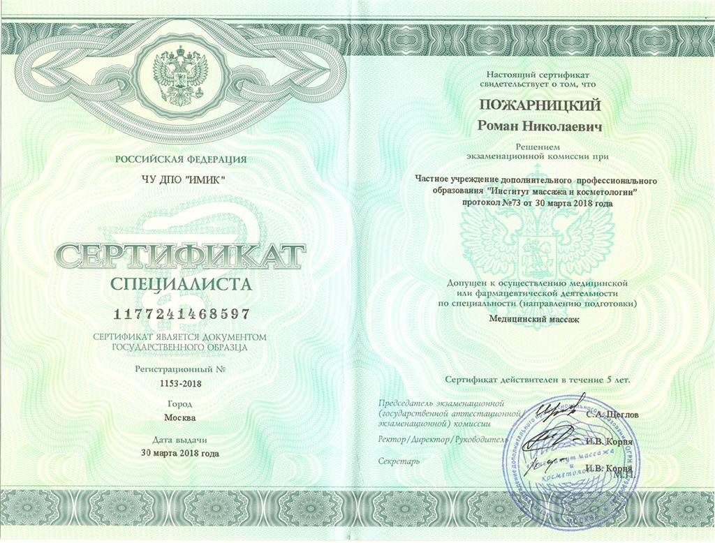 Сертификат специалиста, Москва, 2018. Выдан частным учреждением дополнительного профессионального образования «Институт массажа и косметологии». Подтверждает право на осуществление профессиональной деятельности по специальности «медицинский массаж».
