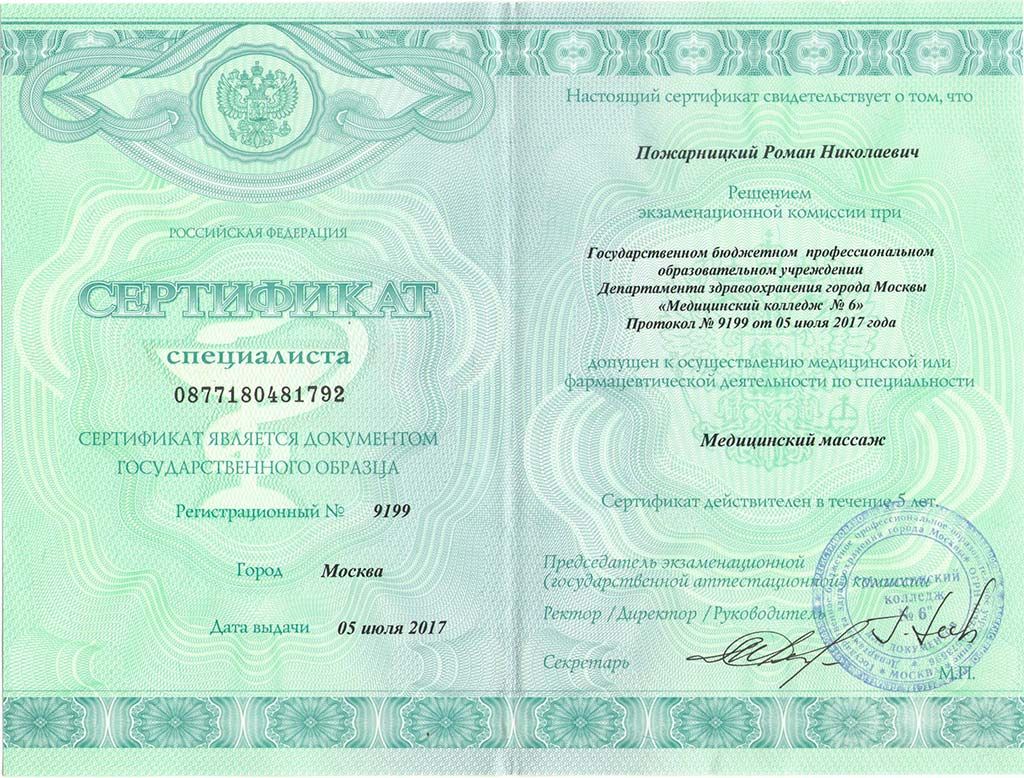 Сертификат специалиста, Москва, 2017. Выдан ГБПОУ Департамента здравоохранения города Москвы «Медицинский колледж № 6». Подтверждает право на осуществление профессиональной деятельности по специальности «медицинский массаж».