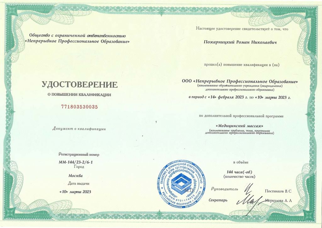 Удостоверение о повышении квалификации, подтверждающее прохождение Пожарницким Романом Николаевичем профессиональной программы «Медицинский массаж» в объёме 144 часов. Обучение завершилось успешным освоением программы, что даёт право на профессиональное применение полученных навыков в области медицинского массажа.